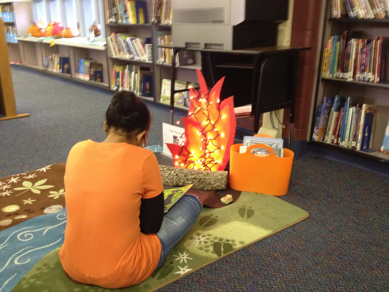 You don’t need anything complicated to recreate this in your own library. My campfire is a cardboard structure I painted with red, orange, and yellow swirls to mimic flames. Around the top of the cardboard, I loosely draped a strand of orange string lights to give it that glowing effect. At first, I tried covering the lights with tissue paper to hide the wires and bulbs. It did look more realistic, but the tissue paper heated up very quickly, and I didn’t feel safe leaving it that way. Safety first! The glow of the lights alone is plenty to capture the mood.