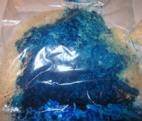 After the colored liquid is worked all the way through the bag, pour it into a tray or pan or bowl to dry. Since it’s still in the high nineties here in San Antonio, even though it’s almost October, I think it will get dry in the bowls. If I was in a cooler place (as I am sometimes in my imagination) I would spread the rice out more in a flat pan.