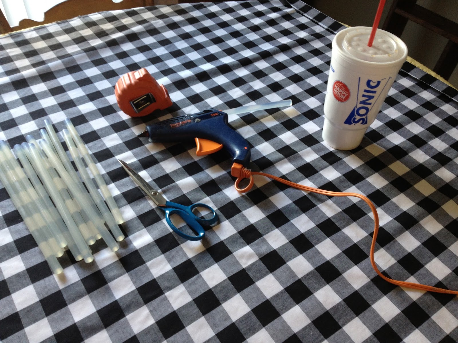 The only supplies you need for this project are fabric, measuring tape, scissors, hot glue gun, and your favorite beverage. And remember the very important rule of the glue gun: DON’T TOUCH THE HOT GLUE!! IT BURNS!