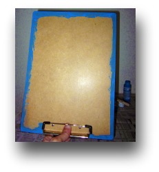 STEP ONE: Paint around the outside edges of the clipboard with acrylic paint, using your foam brush. These edges will not be covered with paper, and we don’t want that ugly brown to show up in our finished product. If you have the type of clipboard with the huge metal clip, shown above on the right, paint about an inch down from the top of the front, too. It is quite a challenge to cut the paper to fit around this huge clip–much easier to paint!