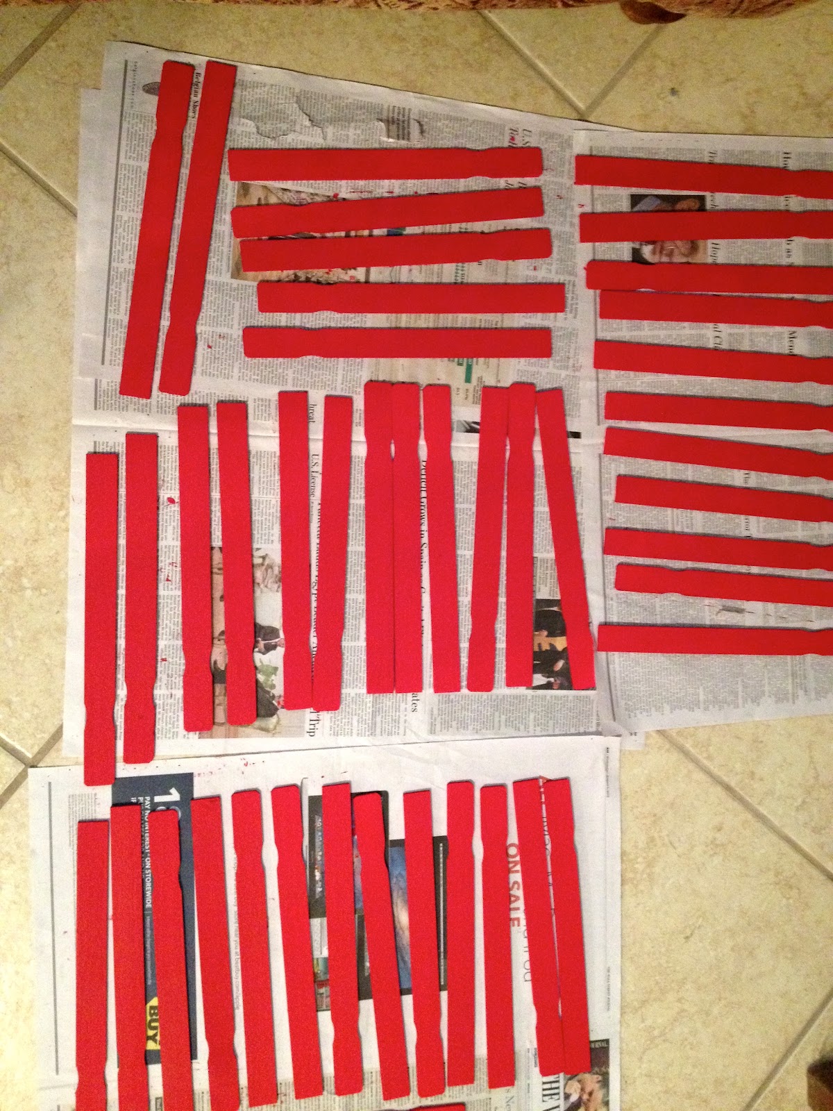 Step Four: Use a foam brush to paint the front, backs, and edges of all of the paint stirrers. This takes a while, because you obviously have to let one side dry before you can paint the other side. If there is any wet paint on the bottom of the paint stirrer when you set it on the newspaper, it will stick to the newspaper and be ugly. Don’t even ask me how I know this.