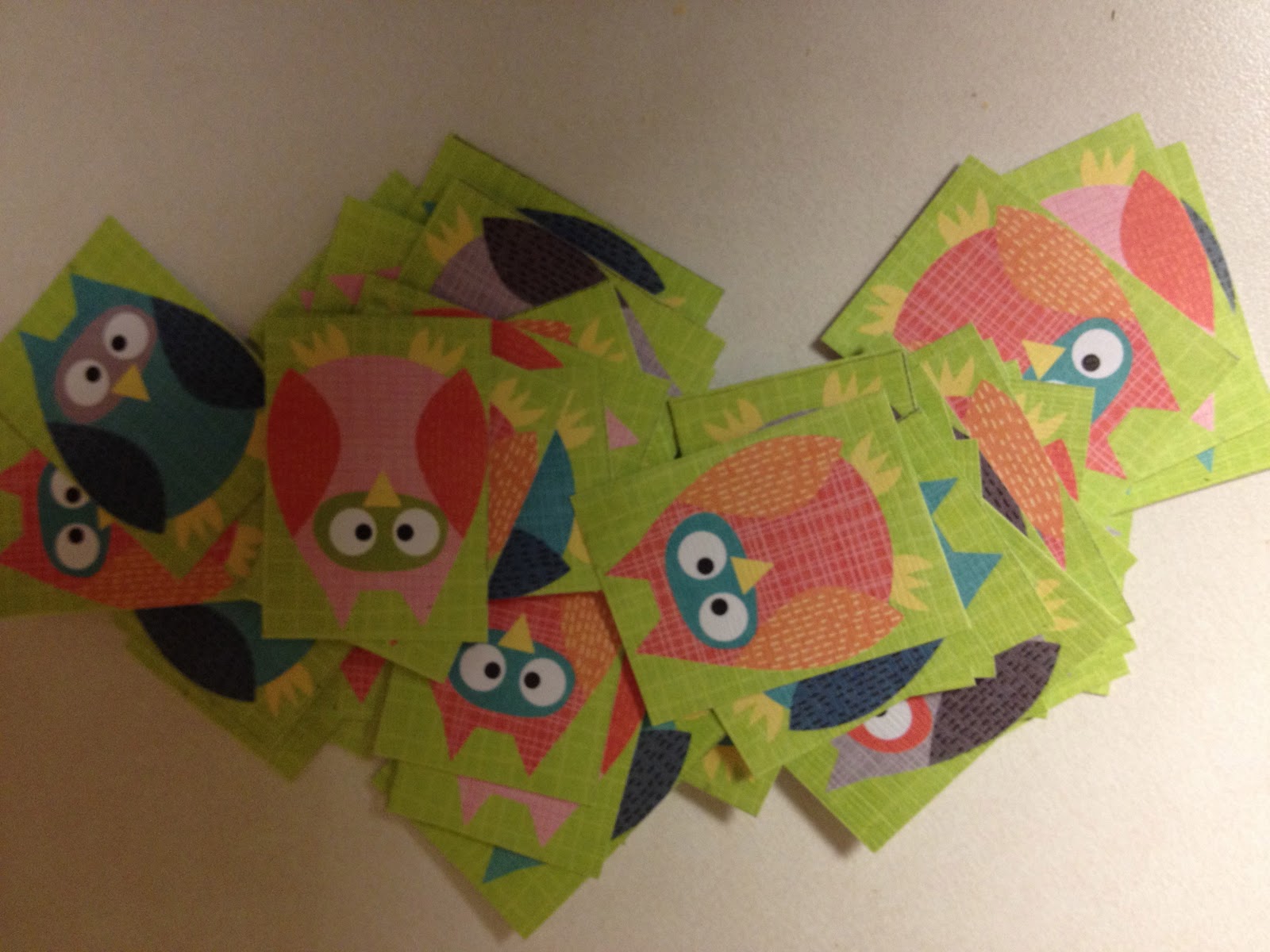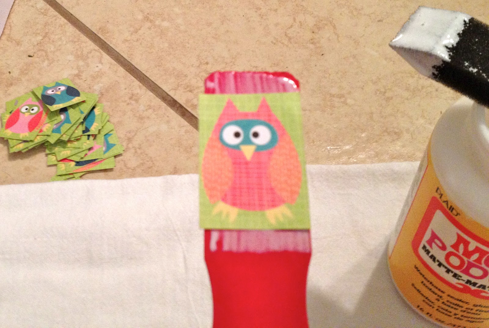 Step Three: Choose one page of scrapbook paper that has lots of little items on it. These will be what you Mod Podge onto the handles of the paint stirrers/shelf markers. I chose a page with colorful owls, and cut them apart. Hint: This would be much easier to do with a paper cutter than it was with scissors and a ruler.